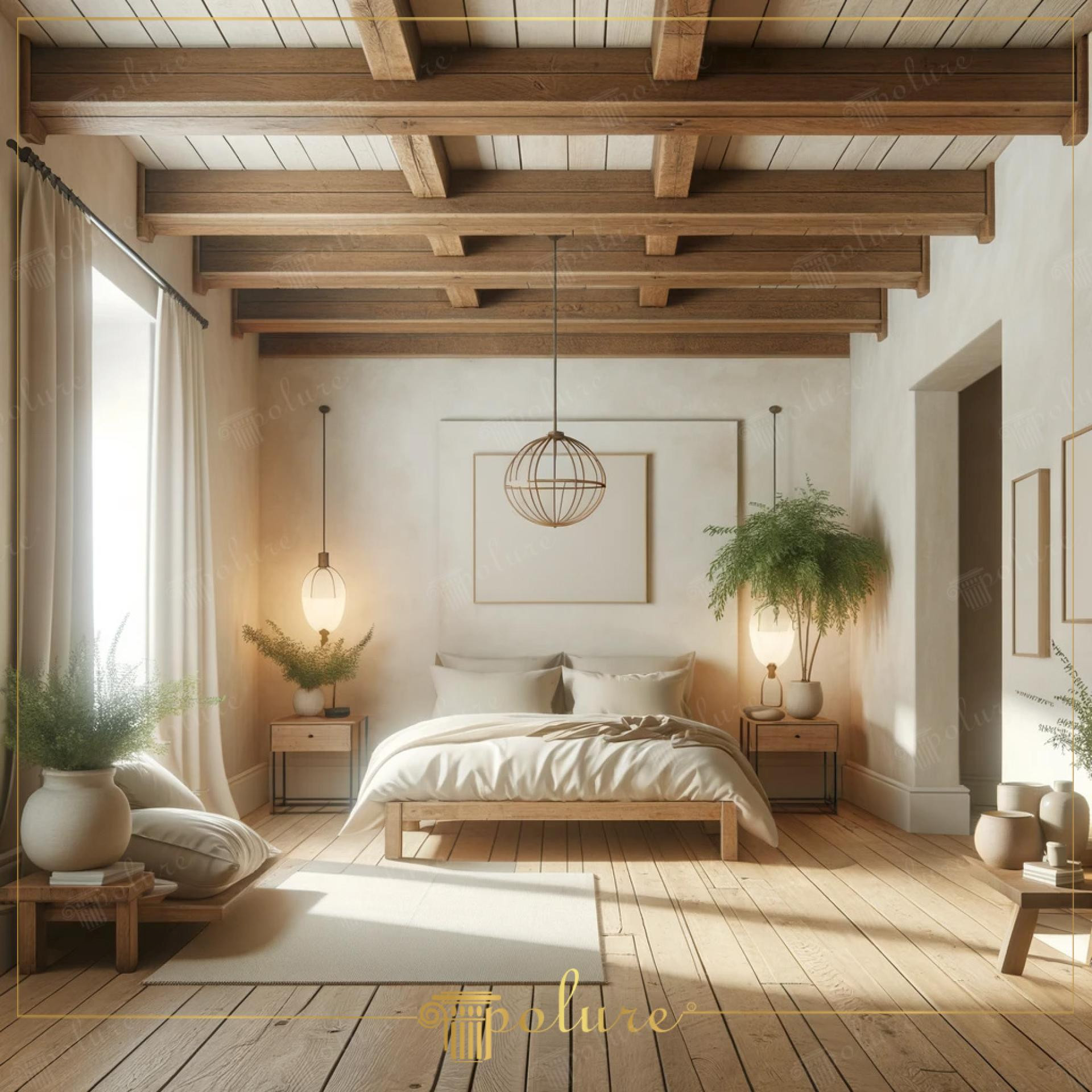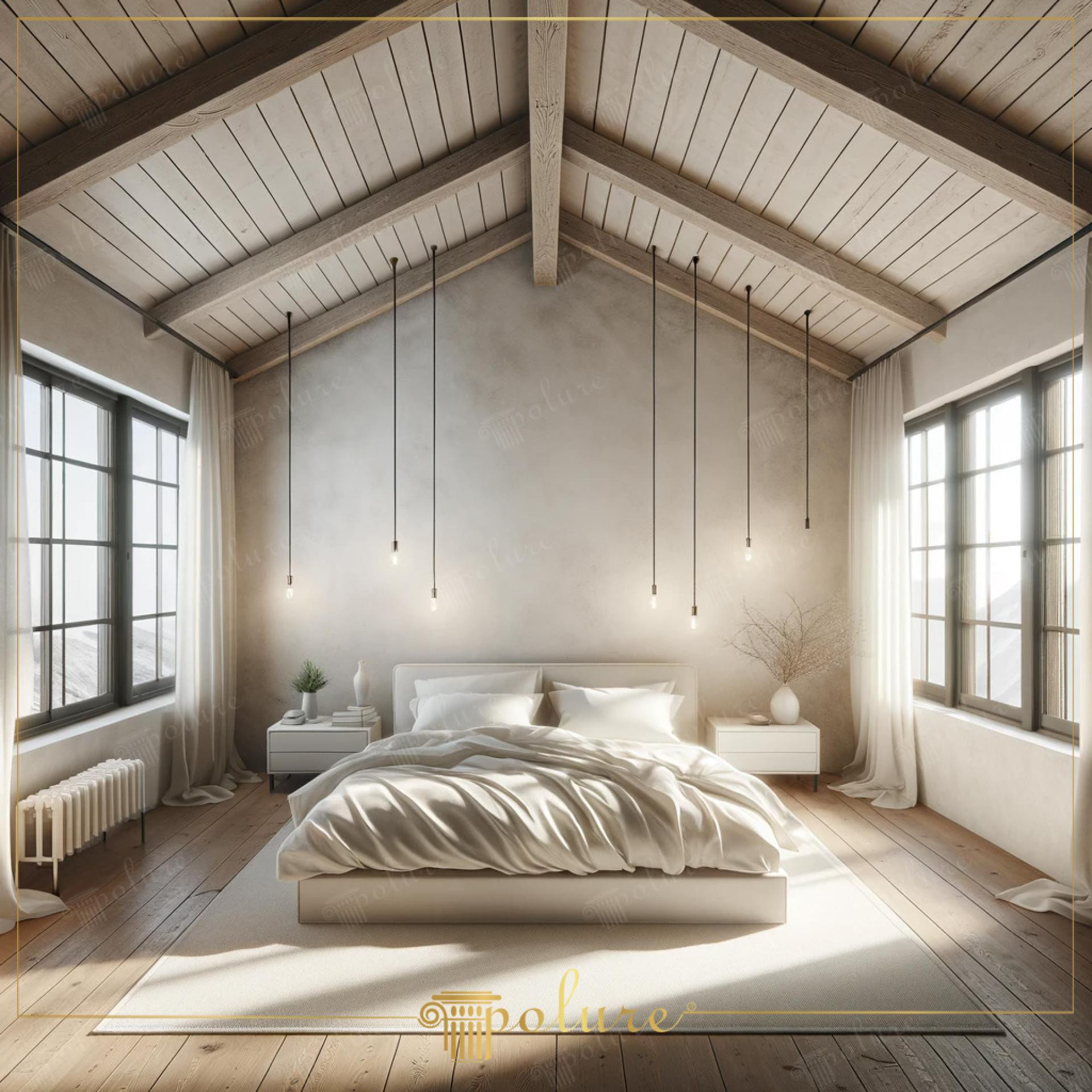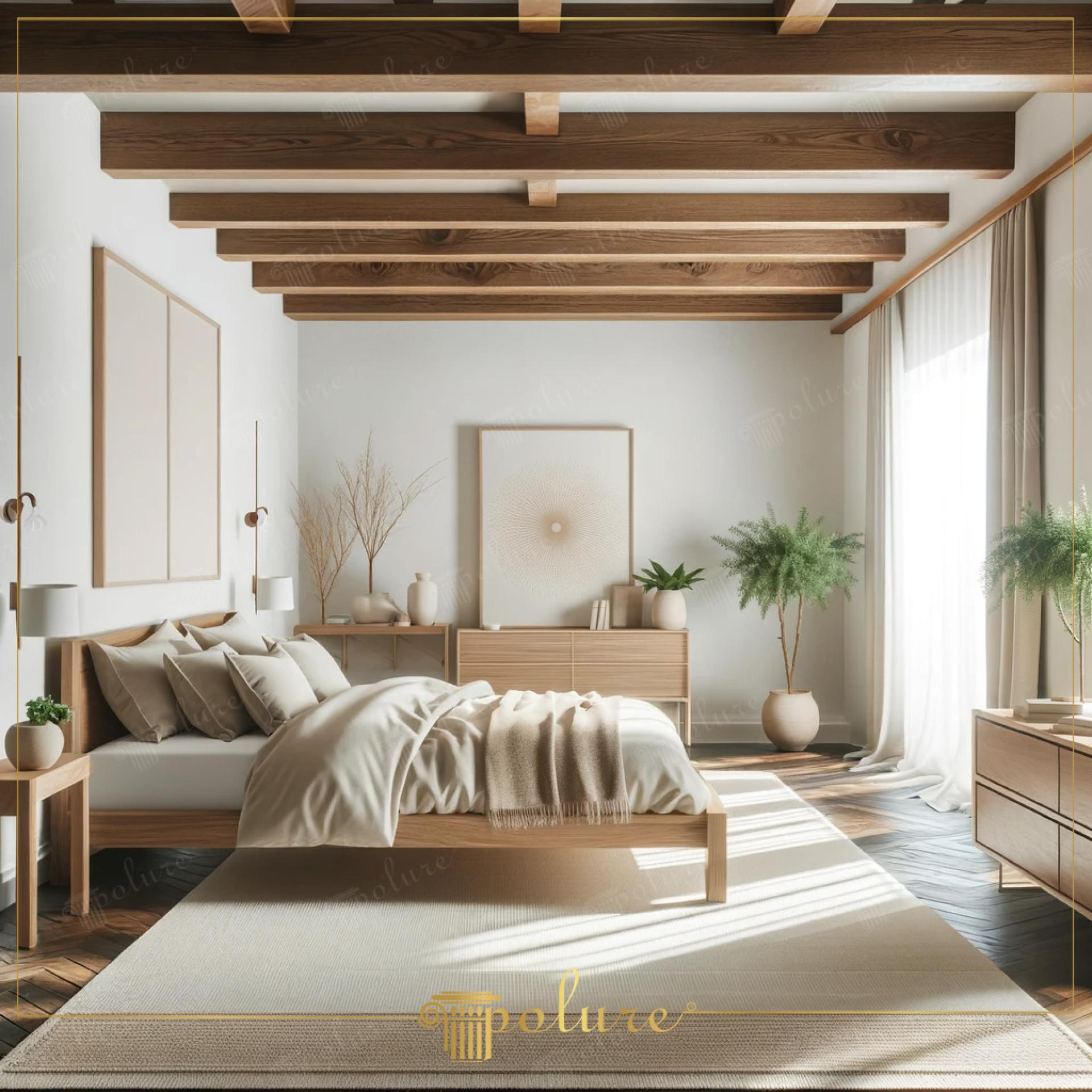 Poliüretan Kiriş ve Merteklerle Modern Rustik Yatak Odası Tasarımı: Ahşap Dokunuşlarla Aydınlık İç Mekan Dekorasyon Fikirleri ve Örnekleri
